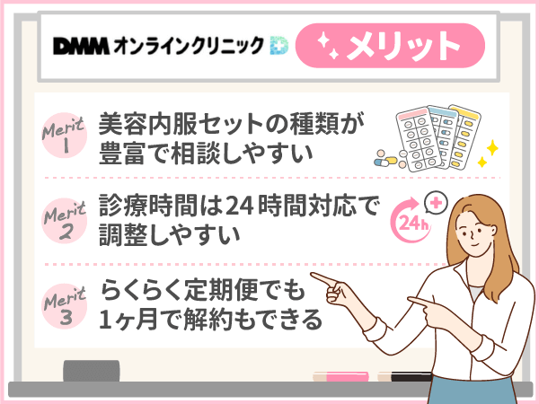 グレイスベルクリニック事業開発部が紹介する美容内服セットが安いおすすめオンライン診療ランキング2位のDMMオンラインクリニックに関するメリットは以下の通りです。