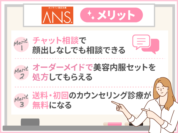 グレイスベルクリニック事業開発部が紹介する美容内服セットが安いおすすめオンライン診療ランキング3位のANS.(アンス)に関するメリットは以下の通りです。