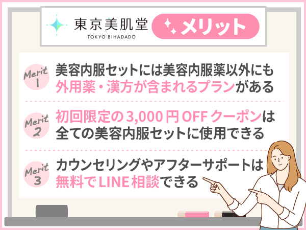 東京美肌堂は、初回限定で3,000円OFFクーポンが配布されるため、はじめて美容内服セットで美肌相談をしたい人でも相談しやすいメリットが評判になります。