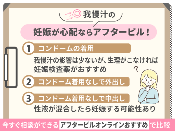| ②コンドームの着用をしないで外だし | 我慢汁に性液が混合したら妊娠する可能性あり →今すぐ相談ができるアフターピルオンラインおすすめで比較 |