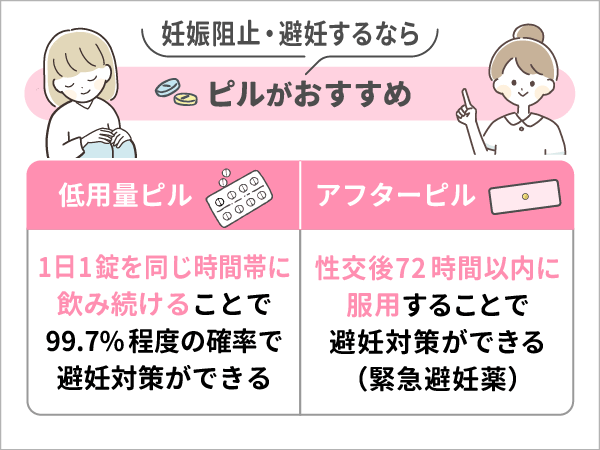 妊娠を防ぐためには低用量ピルを1日1錠の継続した服用やコンドームの装着がおすすめですが、万が一の備えができるようにしましょう。