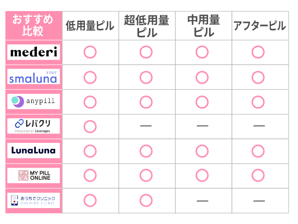 オンラインピル処方おすすめの利用経験がない人や他のサービスと比較したい人は以下を参考にしてください。